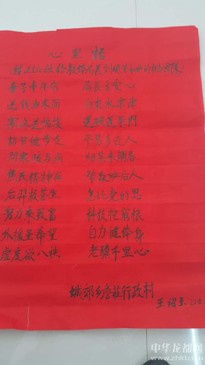“我推敲了幾個半夜,寫了《心里話——謹以此獻給教體局局長劉現營和他的扶貧團隊》這首五言排律,表表我和老伴及全村對您的感激之情。”“妻子十年病,局長多愛心。送錢米油面,自來水津津。寒冬送棉被,送炭至柴門。訪貧健步走,平易又近人?!蓖踅B玉聲情并茂地朗讀著,劉局長爽朗地笑了,“老伴劉桂蘭藥按時吃了嗎?”“按時吃了,多虧您,到我家宣講扶貧政策,幫助我聯系有關單位,我老伴享受了慢性病醫保?!薄肮鹛m說,人家劉局長隔三差五給咱送米面油,逢年過節給咱送慰問金,前幾天頂風冒雪送來兩床被子,一年不知來了多少趟,待咱比親人還親??!我家也沒有什么拿出手的,我倆一合計,就發揮我的一點專長,給您寫了首詩,您經常去我家噓寒問暖,我今個也來您這,算是走走親戚吧,回報回報您!”