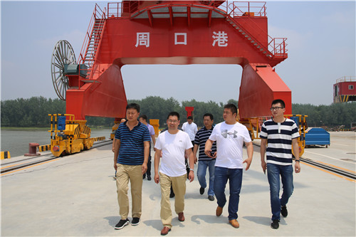 當天上午,宿遷市港口發展有限公司董事長尤勇、江蘇連云港灌河港國際港務有限公司副總經理鄒平海攜公司人員來到周口中心港碼頭,尤勇、鄒平海一行首先參觀中心港碼頭4#5#港池,周口中心港碼頭運營辦主任段傳奇向他們詳細介紹了碼頭運營現狀、吊裝設備使用情況、圍繞周口中心港打造的多式聯運建設進度和長遠規劃。