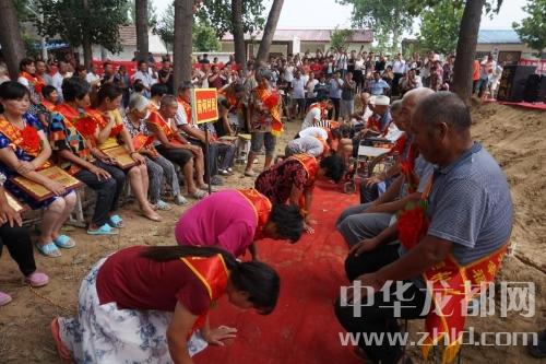 儀式上宣布了對前何行政村31戶孝老愛親之家進行表彰的決定,并為他們頒發了“馬廠鎮孝老愛親之家”牌匾。在《愛的奉獻》樂曲伴奏下,31個孝老愛親之家的孝順兒子、孝順兒媳婦向自己的父母行跪拜之禮。