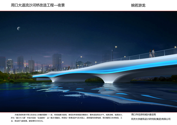 中原路跨沙潁河大橋,橋型采用下承式組合拱橋,遠(yuǎn)看像一輪新月,展現(xiàn)出了“一輪明月照古城”的美景。洼沖溝政通路橋以”振翅高飛的翅膀“為造型元素,在新建人行道橋內(nèi)側(cè)采用鋼結(jié)構(gòu)塑造翅膀造型,同時(shí)對(duì)人行橋營(yíng)造出廊道的意境。洼沖溝人和路橋以“太極魚(yú)”為設(shè)計(jì)元素,體現(xiàn)“天人合一”。流沙河騰飛路橋拱圈外傾,形似一只翩翩起舞的蝴蝶。流沙河大成路橋兼具現(xiàn)代鋼橋和傳統(tǒng)拱橋的美感,充分體現(xiàn)周口厚重的歷史文化。
