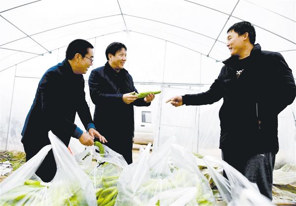近日,周口報業傳媒集團幫扶村——淮陽縣馮塘鄉劉莊村的扶貧蔬菜大棚最后一棚辣椒采摘上市。據了解,這里產的辣椒個頭大、口感好,很暢銷。圖為周口報業傳媒集團黨委副書記、總編輯、周口日報社總編輯顧玉杰(中)向種植戶了解辣椒銷售情況。 記者 梁照曾 攝