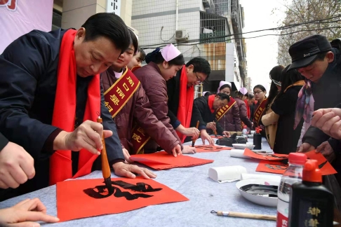 18日上午9時30分,位于新建街的周口儷嬰婦女兒童醫(yī)院門前喜氣洋洋,張燈結(jié)彩,熱鬧非凡,儷嬰婦女兒童醫(yī)院邀請市書協(xié)、川匯區(qū)書協(xié)的書法家們,在門前為“送福送健康暨書法家義寫春聯(lián)”活動舉行了簡短的儀式,隨即活動展開,一邊是儷嬰婦女兒童醫(yī)院的專家們將坐診臺搬到門前,細(xì)致地為來往的居民免費(fèi)量血壓、把脈等義診,一邊擺下10多張桌子和筆墨紙硯,中國書協(xié)會員游保峰,著名書法家、川匯區(qū)書協(xié)終身名譽(yù)主席李大慶,書法家馮干敏、李輝、李國斌及川匯區(qū)書協(xié)主席李尊杰,市書協(xié)副主席劉廣巖,川匯區(qū)書協(xié)副主席兼秘書長杜忠義,副主席曾祥峰、何楠,著名書法家寇成義等書法家們,展開大紅的紙張,揮毫潑墨,飄著墨香的福字和一對對大紅的春聯(lián),帶著新春的祝福,送到居民手里,一波波居民到自己喜愛的書法家面前,喜討福字和春聯(lián),開心的喜悅洋溢著臉上……