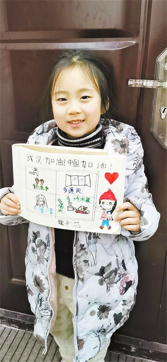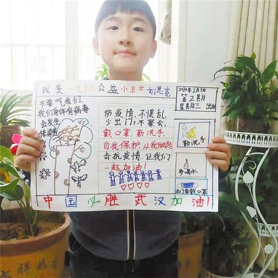 周口六一路小學(xué)近日布置了一項作業(yè),要求學(xué)生設(shè)計一張防疫宣傳小報,為武漢加油。該校學(xué)生用漫畫的形式呼吁大家勤洗手、戴口罩、多喝水、多通風(fēng)。記者 王晨 通訊員 李琨 攝