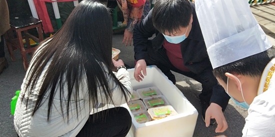 2月22日中午,川匯區小橋辦事處高莊社區疫情防控值勤卡點迎來盛世宴賓樓的大廚們,他們帶著熱騰騰的午餐前來慰問值勤人員,為抗疫一線工作者改善伙食。盛世宴賓樓負責人智廣旭告訴記者,社區疫情防控工作緊張忙碌,他好幾次看到值勤卡點的工作人員用方便面對付一日三餐,心里很感動也很難受,所以飯店決定在疫情結束之前連續贈送午餐晚餐,“讓社區卡點的同志吃好點”。