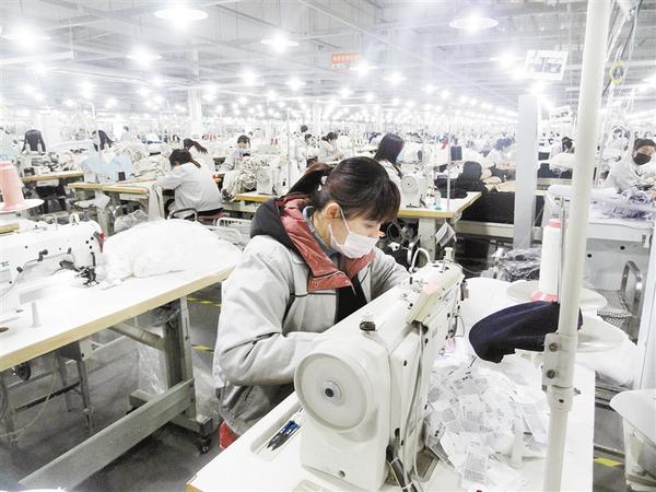 2月26日,商水縣阿爾本制衣有限公司的員工正在生產車間加工服裝。商水縣在嚴格做好疫情防控的同時,又做好企業復工復產工作。目前,該縣10家大型企業和6個扶貧車間有返崗人員3萬多人。喬連軍攝