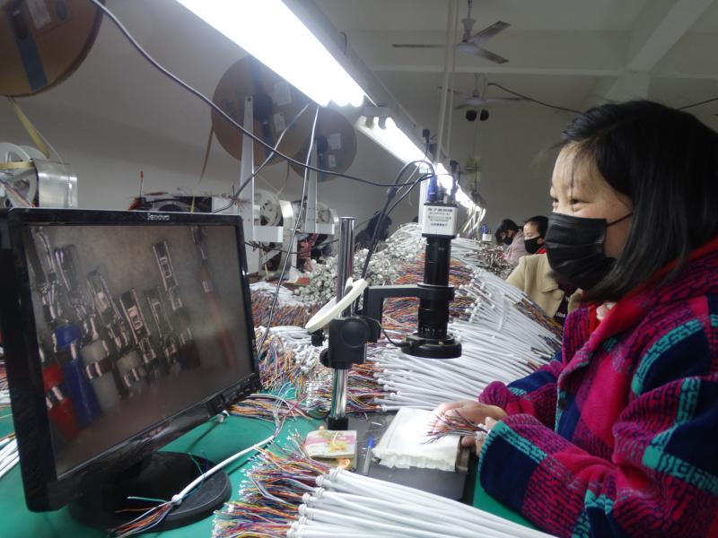 近日,沈丘縣周營鎮眾邦電子來料組裝扶貧車間內,當地村民用電腦檢驗細微端子產品質量。