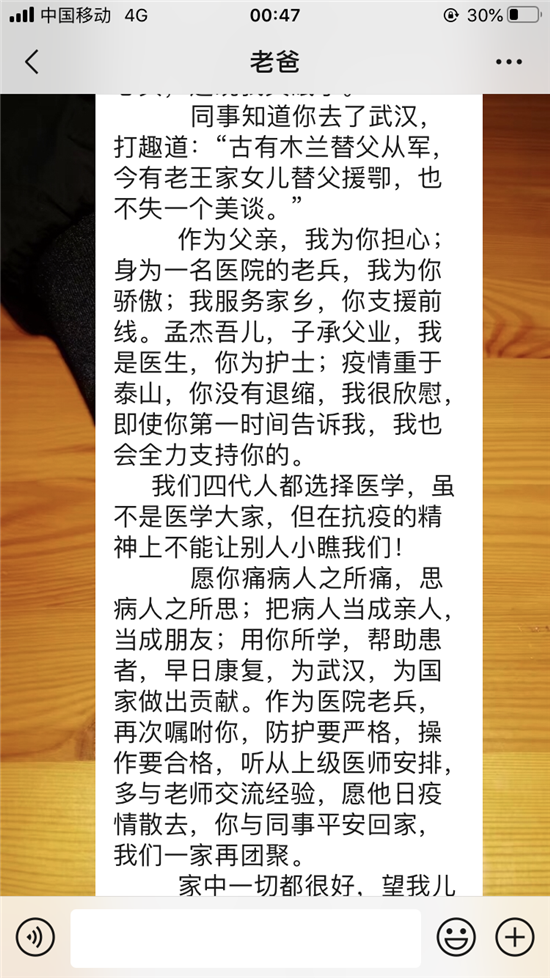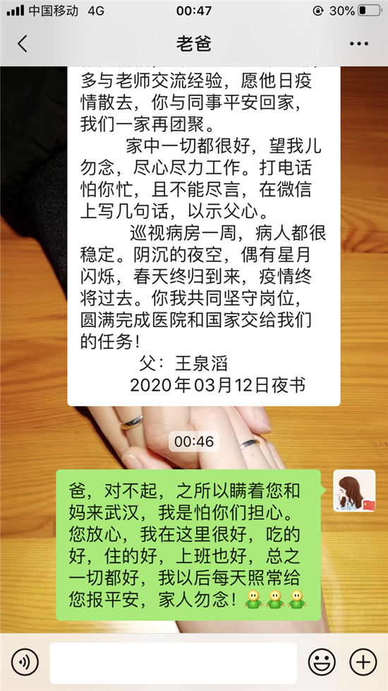 3月21日,周口援鄂醫(yī)療隊出征滿一月。當晚,王泉滔通過微信又鄭重給女兒說下這番話:一晃你在武漢一個月了,我和家人從你去武漢的擔心到現(xiàn)在的放心,這是國家給予我們的安心。農(nóng)民把地種好,教師把學教好,士兵把國門守好,醫(yī)護把病治好,都是自己的使命,更是自己的初心。人人懷揣私字,社會必敗,遭殃的終歸眾人;眾人心懷天下,萬物皆勝,受益的定是人人。看到河南部分援鄂醫(yī)療隊從武漢凱旋歸來,雖然沒有你的身影,但是我們很高興,說明武漢的疫情已得到控制,我和家人一起期盼你早日歸來。但是還是要再次叮囑你,不要因為疫情到了最后而放松警惕,上下班路上注意安全,穿脫防護服不能有一絲懈怠,時刻保持警醒。年前你當了姑姑,雖然還沒有見到你侄子,但他和家人共同期待你平安回來。吾兒加油!