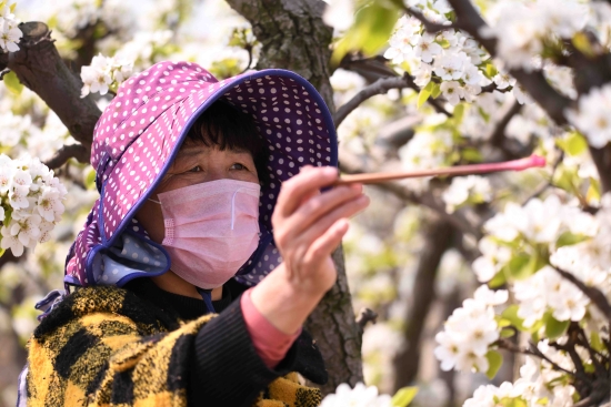 泛區農場的萬畝果園不僅吸引著游客觀光游覽,而且盛產的桃、梨、蘋果,品質好,味道好,吸引著商家訂購,為果農帶來可觀的經濟收入。目前,給梨花授粉是果農在花期中最重要的工作,上圖為果農正緊張地給梨花授粉。