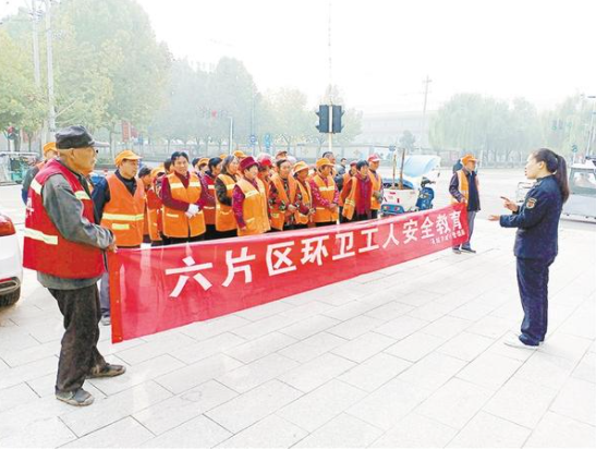 為保障環(huán)衛(wèi)工人的安全,項城市城管局每周二定期對環(huán)衛(wèi)工人開展安全教育,提醒環(huán)衛(wèi)工人霧天不上主干道、掃地順車道、過馬路注意信號燈等,增強(qiáng)了環(huán)衛(wèi)工人的安全交通意識。圖為項城市城管局六片區(qū)負(fù)責(zé)人為環(huán)衛(wèi)工人講解安全知識。