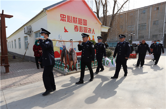 隨著春節(jié)日益臨近,該派出所所長(zhǎng)楊杰和大家商議,“送溫暖送祝福”活動(dòng),應(yīng)該先從尊老愛(ài)幼開(kāi)始。于是,民警們購(gòu)買(mǎi)了60斤魚(yú)、100斤雞蛋和2袋面粉,利用中午休息時(shí)間來(lái)到敬老院,給老人們送上新春祝福。