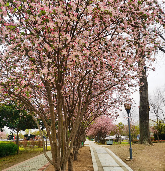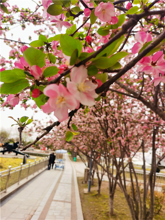 日前,周口公園里的海棠紛紛綻放。在公園內(nèi)的道路上,海棠已進(jìn)入盛花期,粉色的花朵如夢似幻,令人沉醉。