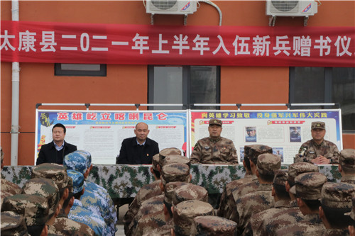 于永前表示,此次贈書儀式意義重大,體現了縣委、縣政府對太康縣2021年上半年新兵的關心和厚愛;體現了全縣160萬父老鄉親對我縣即將入伍的190名新兵的期望和重托;希望每名同志安心入伍,踏實工作,把太康縣好的光榮傳統及各個家庭好的家風帶到部隊,把太康水東精神帶到部隊,在部隊建功立業。