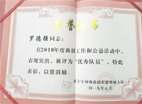 鄲城縣神鷹救援隊(duì)隊(duì)長(zhǎng)劉勇說(shuō),正是看到了羅德強(qiáng)的優(yōu)秀品質(zhì),2018年將羅德強(qiáng)吸納為神鷹救援隊(duì)員?!吧聱椌仍?lián)盟鄲城大隊(duì)隸屬于中國(guó)神鷹救援隊(duì),由各個(gè)行業(yè)的志愿者組成,也是河南省成立最早的一支民間救援隊(duì),除參加全國(guó)各地災(zāi)后救援活動(dòng)外,日常積極參加社會(huì)志愿者活動(dòng)。”“我一個(gè)人的力量很有限,加入這個(gè)優(yōu)秀集體,能夠?qū)W到更多專業(yè)救援知識(shí),從而幫助更多的人,我感到非常驕傲和自豪?!绷_德強(qiáng)說(shuō)。2019年8月10日,受第九號(hào)臺(tái)風(fēng)“利奇馬”影響,山東省壽光市、東營(yíng)市等部分地區(qū)遭受洪災(zāi)。8月11日晚上,紅十字神鷹救援聯(lián)盟鄲城大隊(duì)趕赴山東壽光救災(zāi)。面對(duì)洪災(zāi),羅德強(qiáng)和其他救援隊(duì)員不畏辛苦,劃船深入各個(gè)受災(zāi)鄉(xiāng)村救助被困群眾。壽光市一鄉(xiāng)鎮(zhèn)3處大閘因斷電出現(xiàn)險(xiǎn)情,需要人力進(jìn)行開閘泄洪。羅德強(qiáng)和隊(duì)員冒險(xiǎn)攀爬到大閘上進(jìn)行人工作業(yè),經(jīng)過(guò)3個(gè)多小時(shí)的奮戰(zhàn),3處大閘全部打開,安全泄洪。2019年9月1日,參加泳渡日月潭返程途中,羅德強(qiáng)在福建高速公路上,發(fā)現(xiàn)前方車輛發(fā)生車禍,一名司機(jī)腿部骨折、血流不止。他立即下車和司機(jī)溝通,一邊報(bào)警,一邊利用專業(yè)救援知識(shí)打開變形的車門,順利將司機(jī)救出?!坝捎谶^(guò)度驚嚇,司機(jī)以骨折為由拒絕下車。當(dāng)我告訴司機(jī)自己是神鷹救援隊(duì)員、救援技術(shù)過(guò)硬后,才同意我們施救。”當(dāng)時(shí)高速上車流密集,情況十分危險(xiǎn),如果司機(jī)不能及時(shí)救出,后果不堪設(shè)想?!拔覀冘囕v加油、住宿、吃飯等救援費(fèi)用都是隊(duì)員AA制負(fù)擔(dān),從來(lái)不給當(dāng)?shù)卣蚓戎颂砣魏温闊?。?/p>