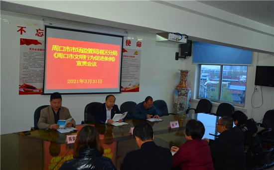 3月31日,周口市市場監督管理局港區分局召開《周口市文明行為促進條例》宣貫會議。局長崔健就如何學習、遵守、貫徹、宣傳好《周口市文明行為促進條例》向全局同志提出具體要求。