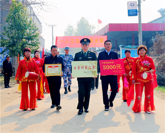 “來啦,來啦!”在鏗鏘激越的鑼鼓聲中,鹿邑縣人武部政委李峰、退役軍人事務局有關領導和賈灘鎮黨委、政府負責人一行人高舉“一人立功、全家光榮”的條幅闊步前來,共同將二等功臣馮秋月的立功喜報和“二等功臣之家”牌匾、獎金、慰問品送到了她父母手中。村民紛紛趕來涌進軍屬的庭院,為功臣馮秋月點贊,向她的家人鼓掌祝賀。