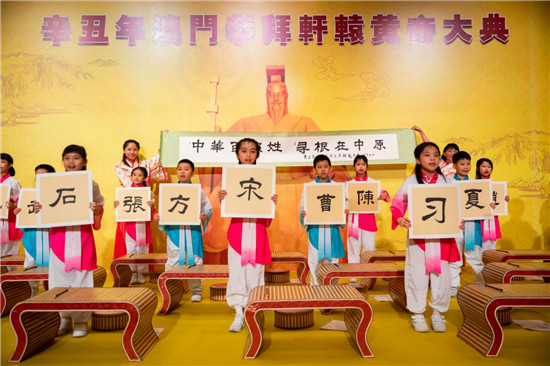 在儀程“高唱頌歌”環節,30名澳門小學生身穿漢服,邊唱《黃帝頌》邊在小書桌上書寫毛筆字。隨后,孩子們舉起書寫的姓氏,后排兩名身穿漢服的老師打開“中華百家姓”卷軸,引來參加拜祖活動的來賓陣陣掌聲。今年拜祖活動現場組織了一個百人的漢服方陣,順應流行的“國潮風”,成為拜祖活動的又一個亮點。