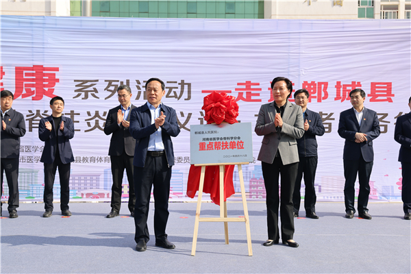 啟動儀式上,王偉、金玉貞,張連仲、張凱先后為鄲城縣人民醫院“河南省醫學會骨科學分會重點幫扶單位”“青少年脊柱側彎和強直性脊柱炎定點篩查培訓醫院(鄲城縣人民醫院)揭牌。