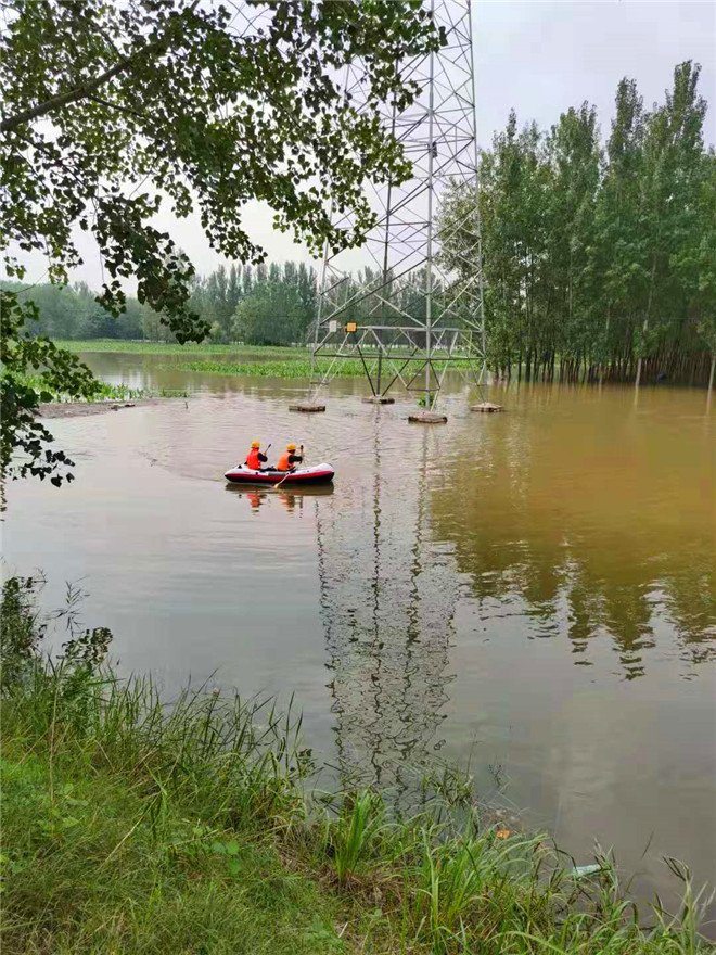 為了確保周口主網高壓線路安全穩定運行,連日來,“小毛”毛學用和他的同事克服困難劃著皮劃艇,人工近距離檢查桿塔基礎泡水情況。