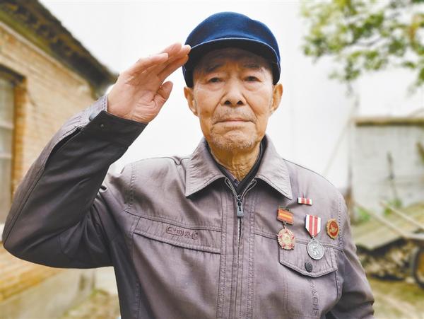 聽說記者要為他照相,老人立即要求家人為他換身干凈的衣服,很認(rèn)真地把軍功章、獎(jiǎng)?wù)乱灰淮髟谏砩希p腿合攏,努力地挺直上身,對(duì)著鏡頭打了一個(gè)標(biāo)準(zhǔn)的敬禮。
