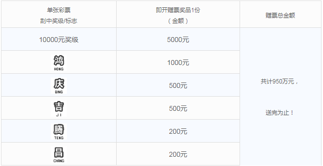活動期間,購彩者在我省任一體彩銷售實體店購買指定活動票種,若單張彩票刮中符合獎勵條件的獎級或標志,經實體店終端兌獎設備成功完成獎金兌付(如中獎)及促銷兌獎掃描后,即可獲得即開票贈票獎品一份。總額有限,送完為止,詳見下表: