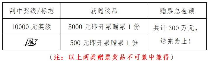 活動(dòng)期間,購彩者在河南省范圍內(nèi)任一體彩銷售實(shí)體店購買指定活動(dòng)票種,若單張彩票刮中符合獎(jiǎng)勵(lì)條件的獎(jiǎng)級或標(biāo)志,經(jīng)實(shí)體店終端兌獎(jiǎng)設(shè)備成功完成獎(jiǎng)金兌付及促銷兌獎(jiǎng)掃描后,即可獲得即開票贈(zèng)票獎(jiǎng)品一份。總額有限,送完為止,詳見下表: