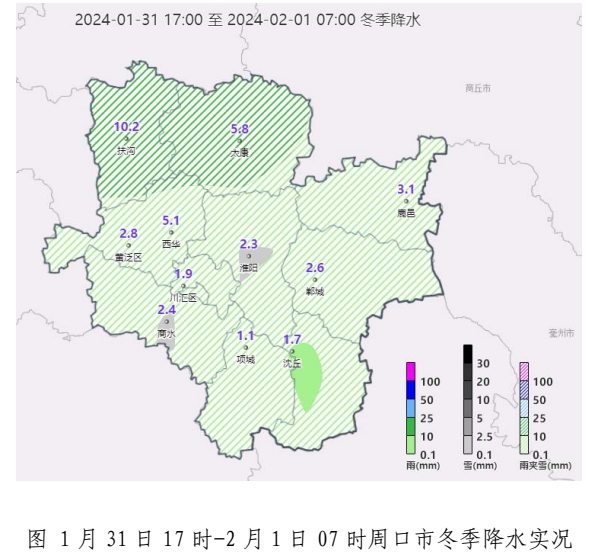 1月31日17時—2月1日7 時,我市出現小雨轉雨夾雪、北部地區中到大雪天氣。截止到1日7時。國家站累計雨雪量(毫米)為:扶溝10.2、太康5.8、西華5.1、鹿邑3.1、黃泛區2.8、鄲城 2.6、商水 2.4、淮陽 2.3、川匯區 1.9、沈丘1.7、項城1.1。各地區7時雪深(厘米):太康5、扶溝4、西華4、黃泛區1、鹿邑1。