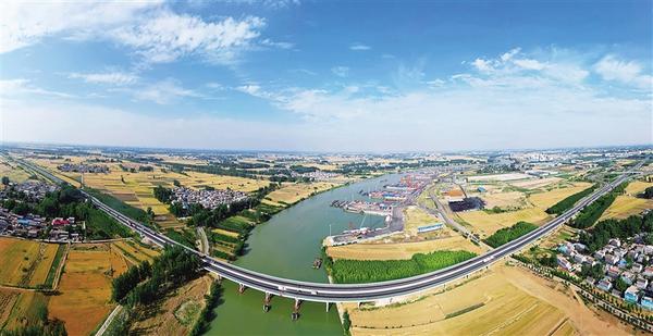• 5月27日,周口港中心港區在碧水、藍天、白云、金色麥浪、秀美村莊的映襯下,顯得十分壯美。近年來,我市利用水陸交通優勢,加快構建“鐵公機水”多式聯運體系,努力從“經濟通道”邁向“通道經濟”。