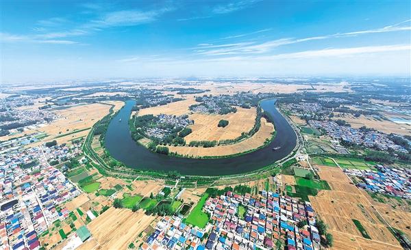 • 6月6日上午,在川匯區官坡村西側,兩艘貨船沿沙河西行。沙河在這里繞了個彎,藍天下,碧水、貨船、村莊、農田宛如一幅油畫,格外美麗,展現了中原港城周口的生態之美。