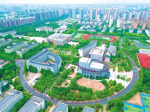 • 六月二十四日上午,鳥瞰周口師范學院校區,曲折小道環抱音樂廳、大禮堂、圖書館等建筑,宛若一把巨大的琵琶,在中心城區奏響文明發展進行曲。