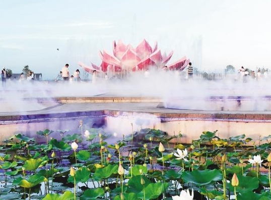 • 7月3日傍晚,淮陽龍湖荷花苑里,前來乘涼的市民絡繹不絕。在一朵粉紅色的荷花造型景觀周圍,噴泉映光影、水霧繞碧荷,如夢如幻,宛如仙境。