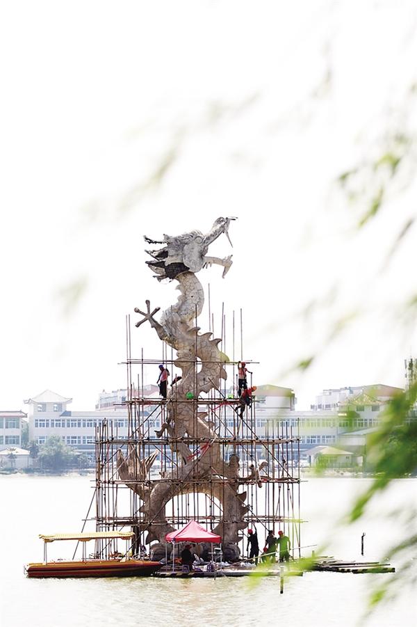 6月5日,建筑工人在搭建腳手架,開始對淮陽龍湖中的9座龍形雕塑進行修繕。 ...[詳細]