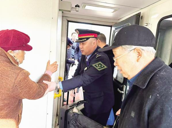 11月22日,由周口開往上海的K1505次列車停靠項城站時,列車長潘玉龍在站臺發現一位乘坐輪椅的旅客李女士,便主動上前提供幫助。