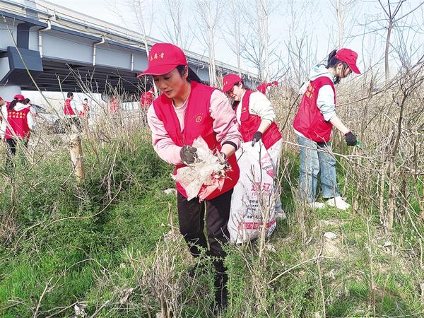 3月22日,志愿者在沙潁河畔撿拾垃圾。當日,67名來自周口市環境保護協會、周口師范學院、周口恒大中學的環保志愿者,在中心城區沙潁河畔開展“世界水日、中國水周,護河凈灘在行動”活動,以實際行動踐行“綠水青山就是金山銀山”理念。