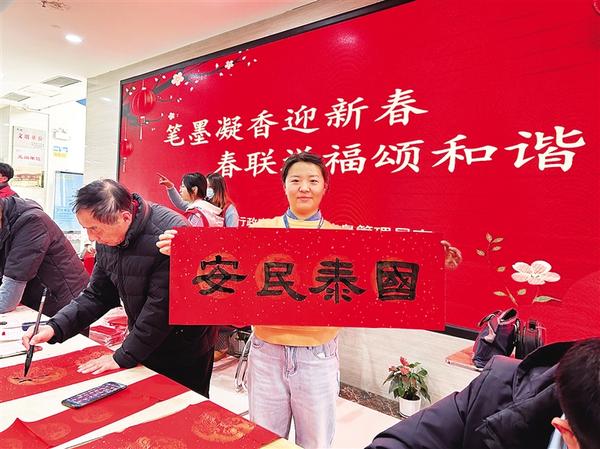 1月20日,扶溝縣政務服務中心一名工作人員展示剛收到的手寫春聯。連日來,我市數千余名書法家、書法愛好者為市民寫春聯、送“福”字,送上美好的祝福。