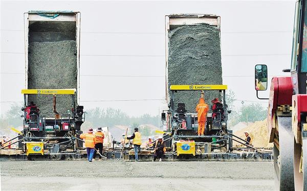 4月24日上午,工人們為329國道改建路段鋪設第一層碎石路基。據了解,329國道改建路段全長5.879公里,西起商水縣童崗村,折而向南又向東,至后趙寨村,呈直角形,為城市主干道,雙向八車道。
