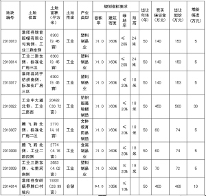 備注:1.2013013、2013014、2013017、2013022、2013037、2013038、2013039宗地位于產業集聚區內,屬兩層以上標準化廠房建設用地,投資強度≥3750萬元/公頃。地上有部分違法建筑物,經政府辦、發改委、財政局、監察局、法制辦、住建局、審計局、房產辦、規劃辦、城市綜合執法局和縣產業集聚區管委會集體研究,地上建筑不再作價與土地捆綁出讓,由土地競得人無償處置地上建筑物。土地出讓合同簽訂后,8個月內必須開工建設,工期24個月,土地成交價款需在土地出讓合同簽訂后60日內繳清,交地時間在3個月內。