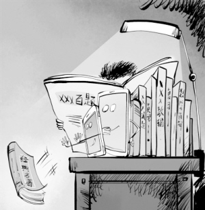 記者調查發現,在繁重的課業負擔下,不少初高中學生所讀書籍越來越單一,教輔書占了絕大比例。智能手機的普及,各類社交平臺的出現,更是讓學生沉溺于淺閱讀。相反,拿起名著、對話經典等深層次閱讀的情況,卻不容樂觀。這正是: