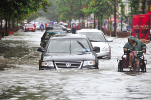 昨日上午8時許,記者走訪市區七一東路、黃河路、大慶路、人民路、工農路、八一路、文明路等主次干道看到,這些路面已經變成汪洋一片。七一東路積水沒膝,不少車輛在水中艱難行駛,由于積水太深,不少汽車被迫熄火。黃色的積水在車子開過后,像浪頭一樣打到附近的商店內,商店的老板紛紛拿起掃帚向外掃水,有的干脆用門板等物品緊急堵門。在工農路、文明路、人民路等路段,許多市民在沒膝的積水中行走,因為下水管道的流量有限,不少下水管道內的雜物倒流出來漂浮在水面,散發出異味。在七一路與大慶路交叉口,一度出現擁堵現象,交警全力疏導交通。