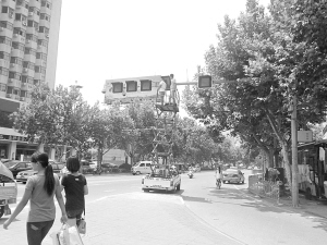8月14日,周口市區七一路與中州大道交叉口的一處紅綠燈發生故障,工人冒著高溫酷暑及時進行搶修,確保交通安全。晚報記者 張洪濤 攝